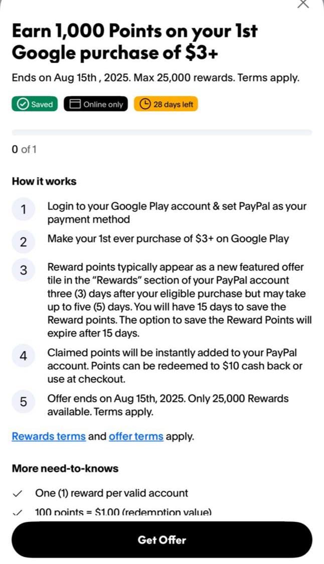 - 仅限首次在 Google 使用 PayPal 付款的交易