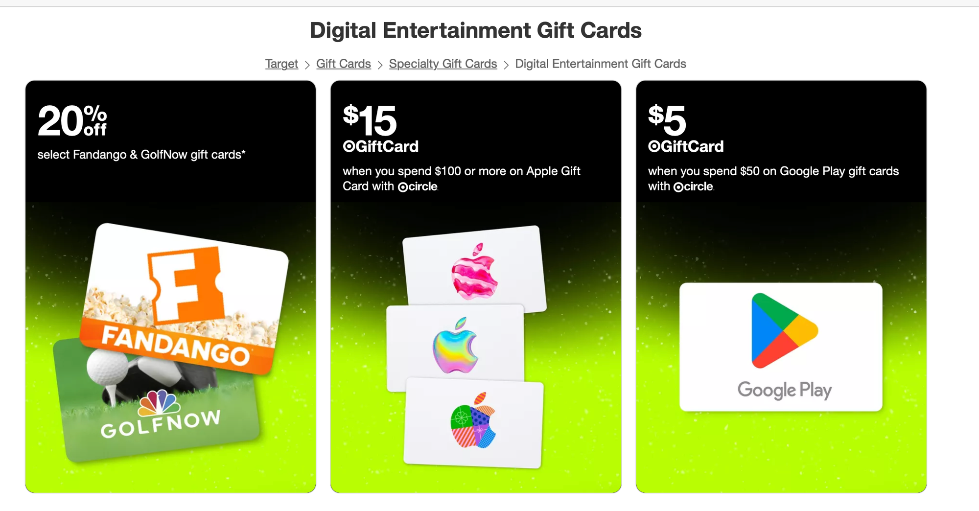 - 购买$50或以上的 Google Play Gift Card,可得$5 Target 礼品卡