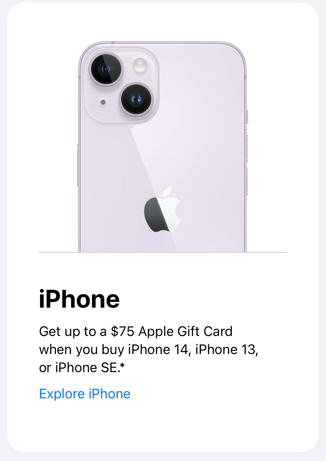 iPhone 系列参与的产品有:iPhone 13、iPhone 14、iPhone SE,最高可得$75 礼品卡