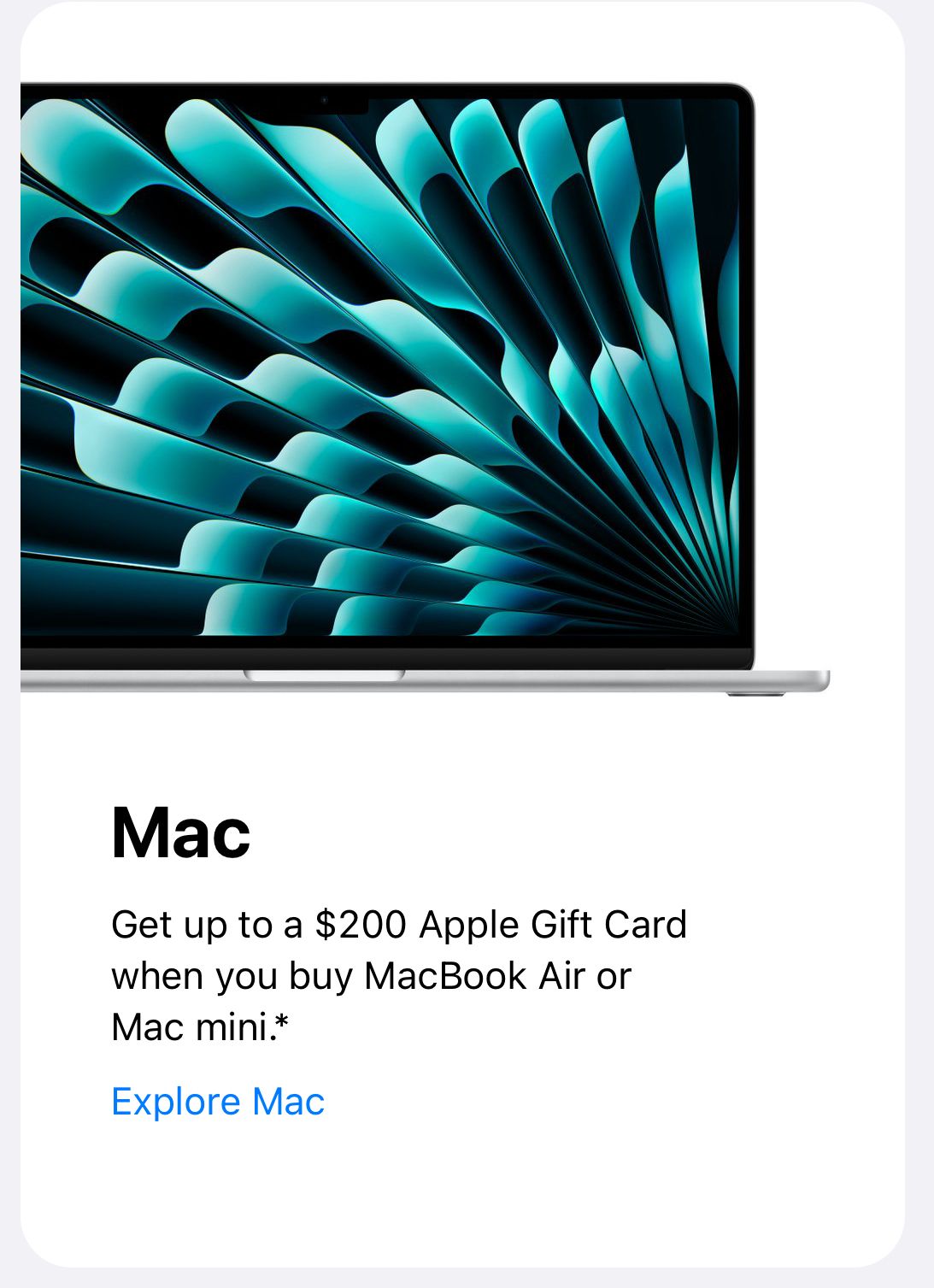 Mac系列参与的产品有:MacBook Air、Mac mini,最高可得$200 礼品卡