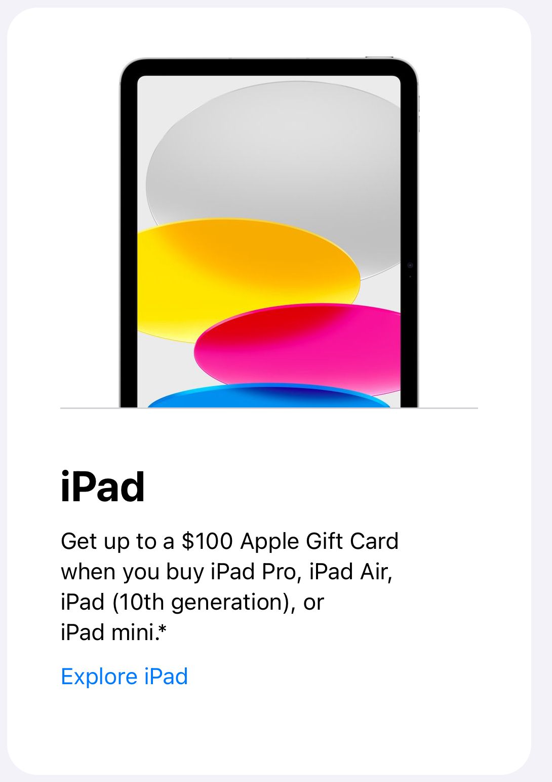 iPad 系列参与的产品有:iPad Pro、iPad Air 、iPad 第10代和 iPad Mini,最高可得$100 礼品卡