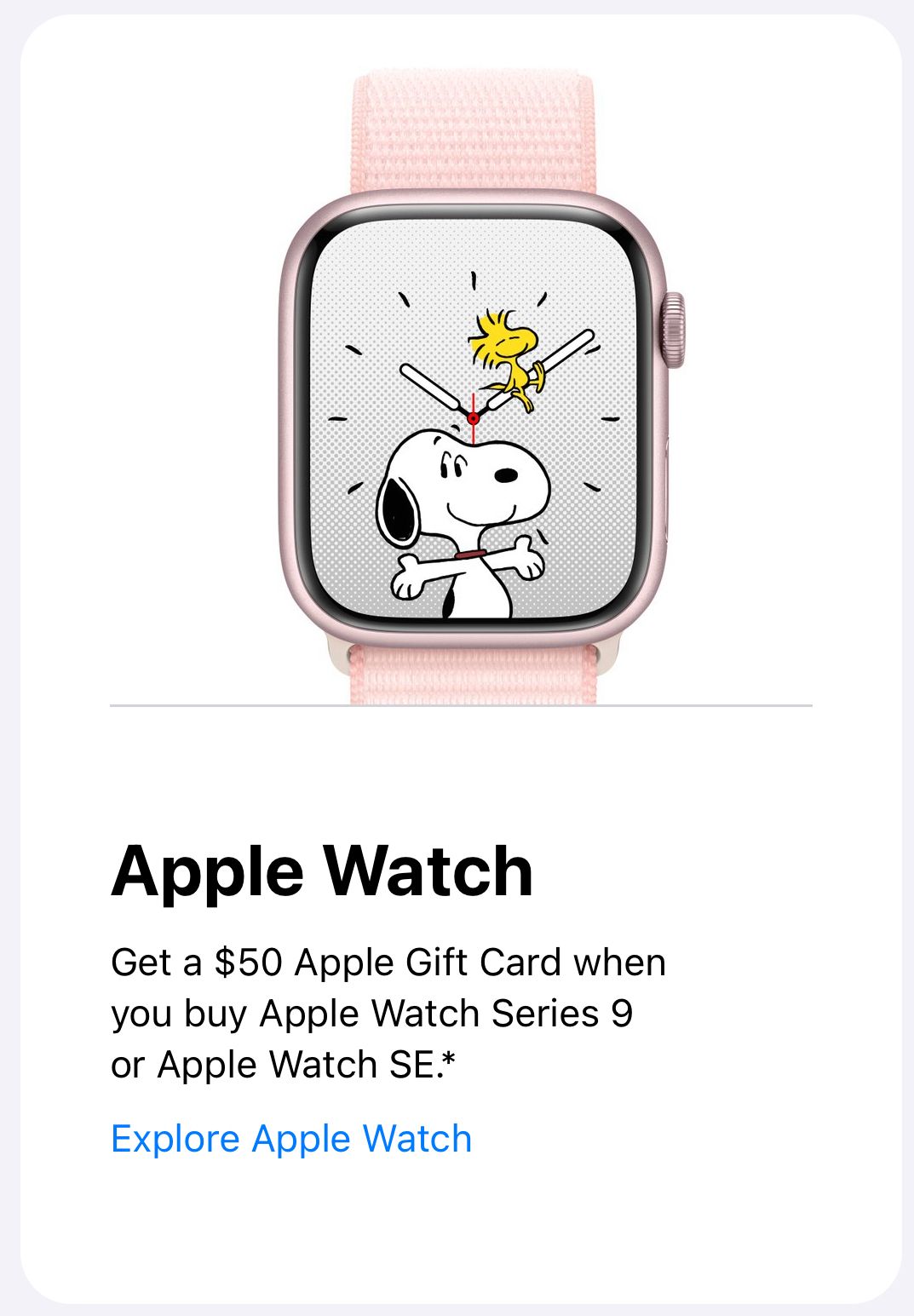 Apple Watch 系列参与的产品有:Apple Watch S9、Apple Watch SE,最高可得$50 礼品卡