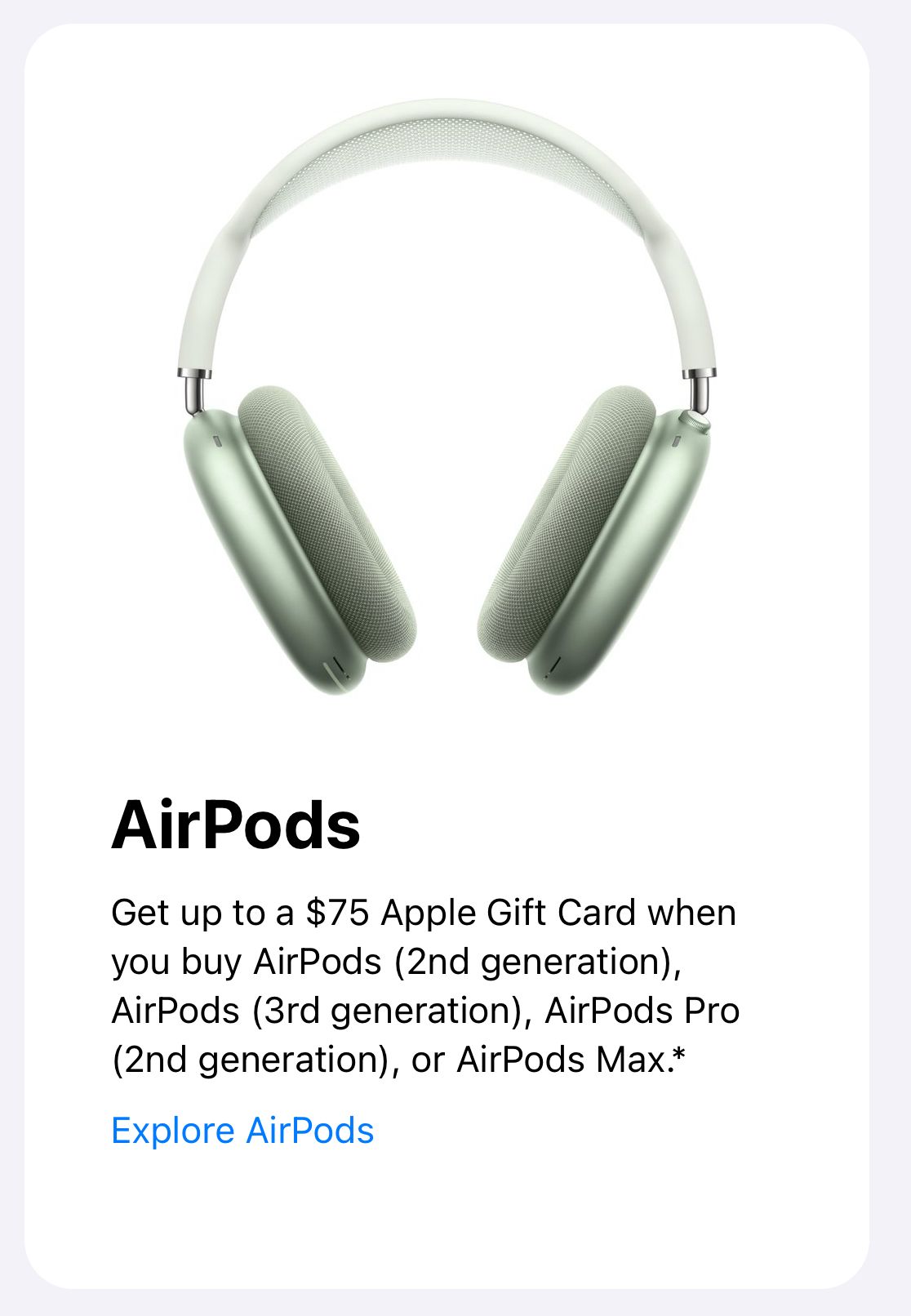 AirPods 系列参与的产品有:AirPods 2代、AirPods 3代、AirPods Pro 2代、AirPods Max,最高可得$75 礼品卡