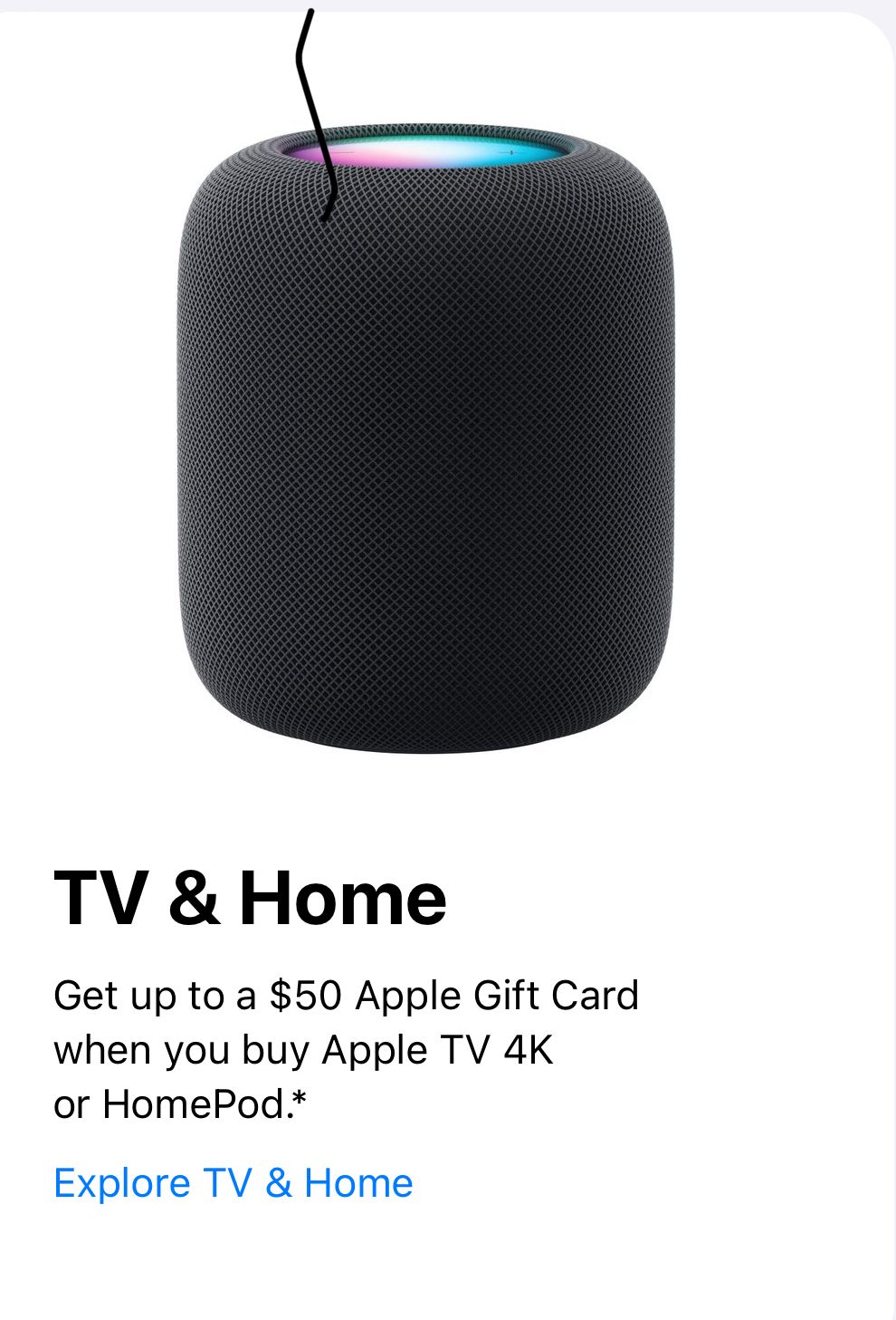 TV & Home系列参与的产品有:Apple TV 4K、HomePod,最高可得$50 礼品卡