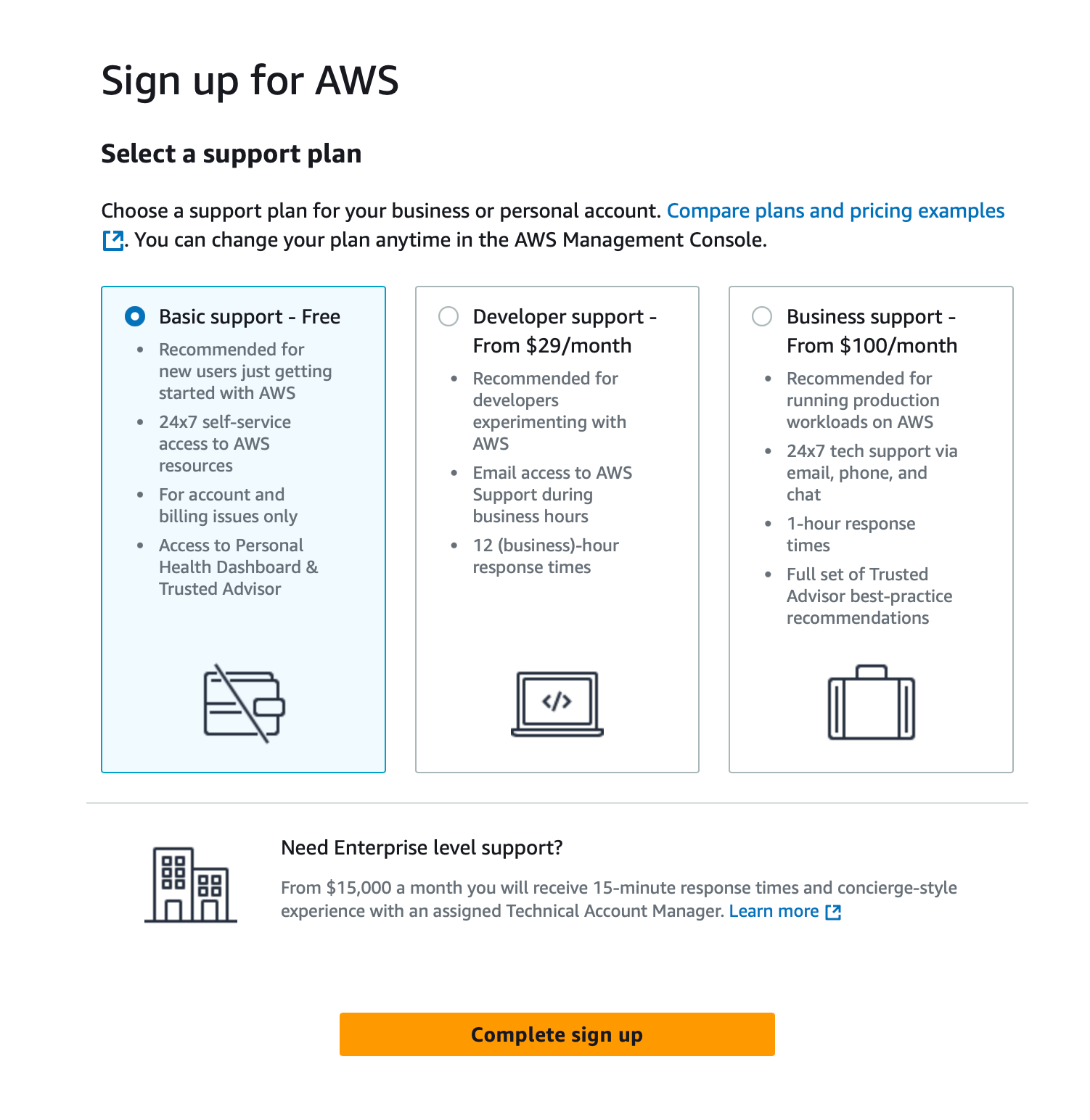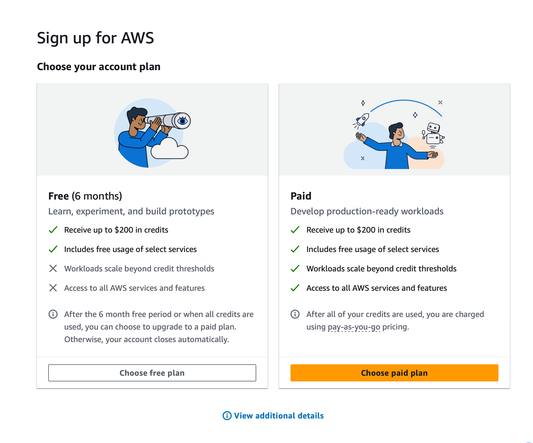 您需要将您的账户升级到付费计划。不过,在某些情况下,您的账户会自动升级为付费计划,比如当您创建或加入 AWS 组织、设置 AWS 控制塔的着陆区、加入 AWS 合作伙伴网络、创建专业服务合同、与 AWS 签订企业协议、购买 AWS 技能构建器团队订阅,或者将您的 AWS 账户指定为符合 HIPAA 或 SEC 规定时。