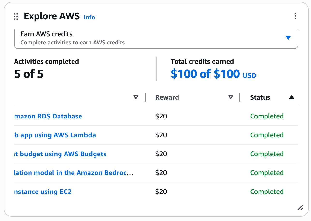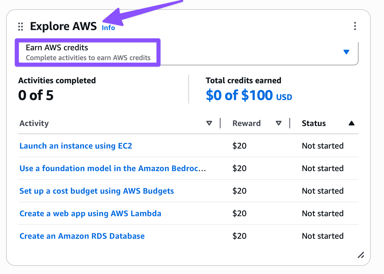 下滑页面,在控制台接近底部的右侧找到 Explore AWS , 在筛选一栏选择 Earn AWS credits ,完成指定任务即可获得相应的免费信用额度。