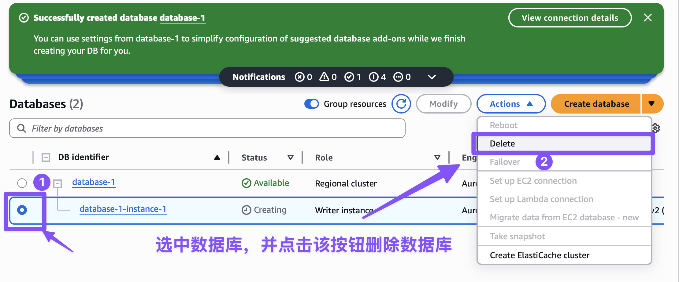 Create an Amazon RDS Database任务后,记得删除该数据库