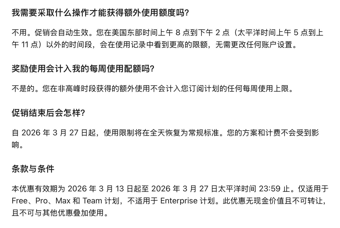 2026 年 3 月 13 日至 3 月 27 日期间,除企业版用户外,非高峰期的使用额度会自动翻倍,无需额外设置。