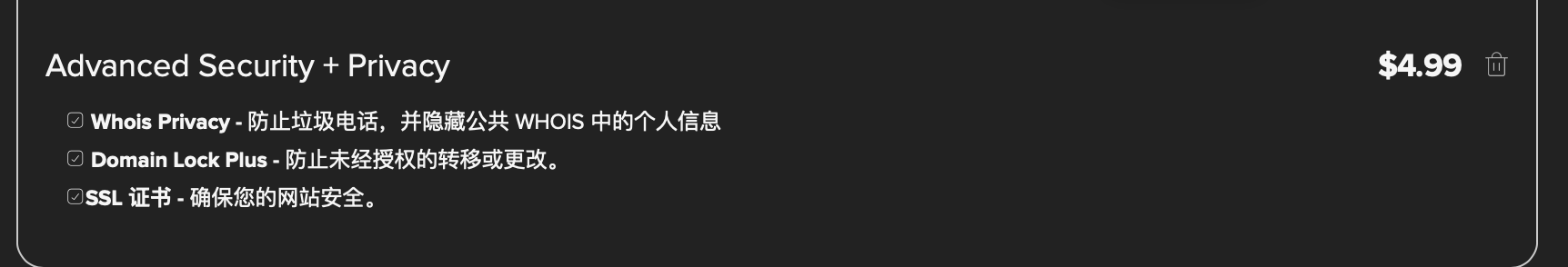 当你将域名加入购物车后,系统会默认帮你选购 Advanced Security 的增值服务,该服务包含了 WHOIS Privacy 保护。如果你不需要,可以点击删除该增值服务。