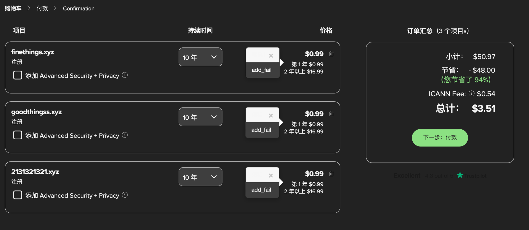 更新:请注意!如果显示 add_fail 则不要下单。有反馈称 10 年同价可能是bug(会变为签约10年,仅支付首年价格)官方只是庆祝10周年,并未在公告中表示 $0.99 可以得到 10 年。