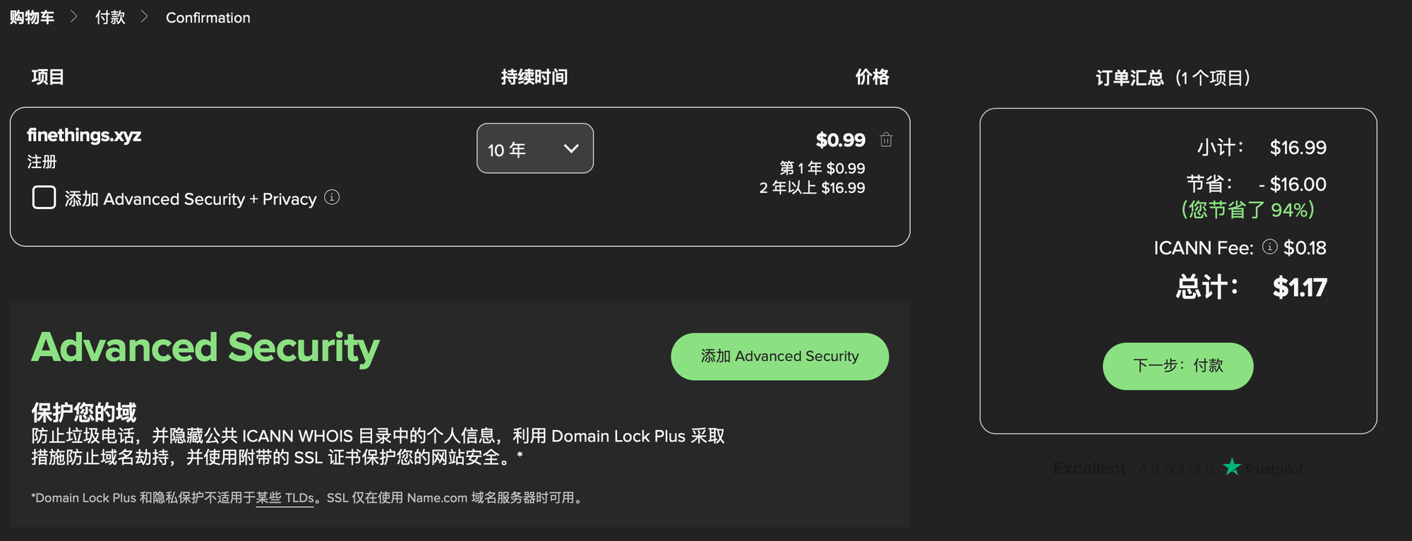 用户可以在这里以 $0.99 的价格 + $0.18的 ICANN 注册费,共计$1.17获得10年 1 年的 .xyz 域名。