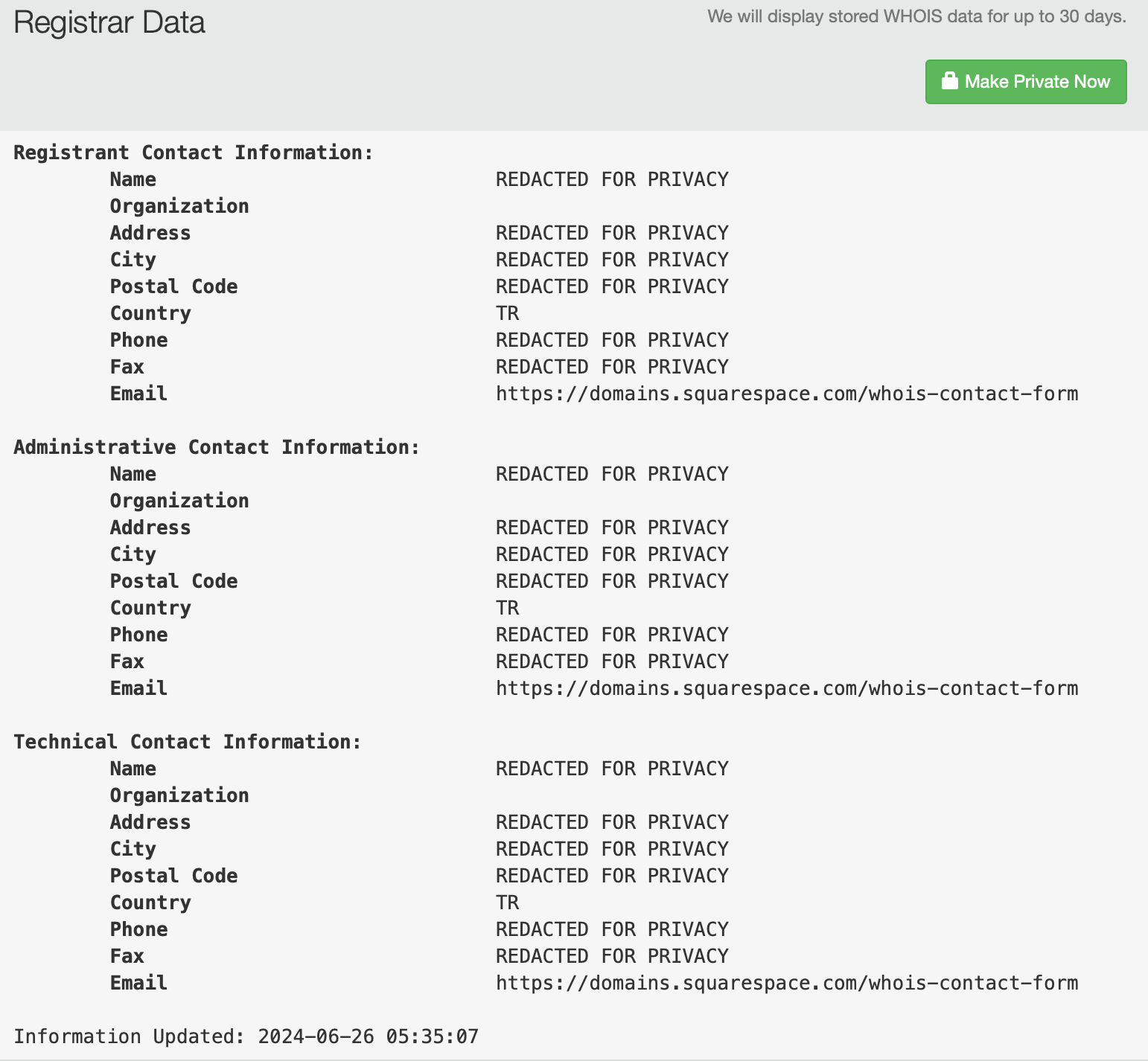 如果你还不知道什么是 Whois Privacy,它的作用是这样的:如果你注册了域名,并且没有开启 Whois Privacy,那么,别人在 who.is 查你的域名,就能看到你注册时留的姓名、地址、电话等等信息。显然,我们不想让这些隐私信息轻易被人肉到。于是,各大域名注册商就推出了 Whois Privacy 服务,使用此项服务,在 who.is 查域名的时候,就只能看到域名注册商的信息,不会看到你的私人信息了。
