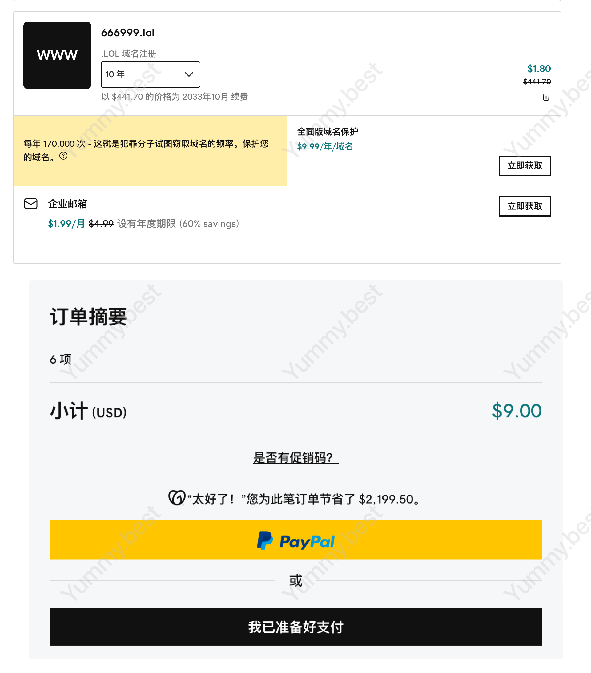由于 PayPal 在新商户首次购买必走 PayPal 的汇率,如果之前没在 Godaddy 用过PayPal的话,推荐先买一个,在官网修改为银行汇率后再继续下单。