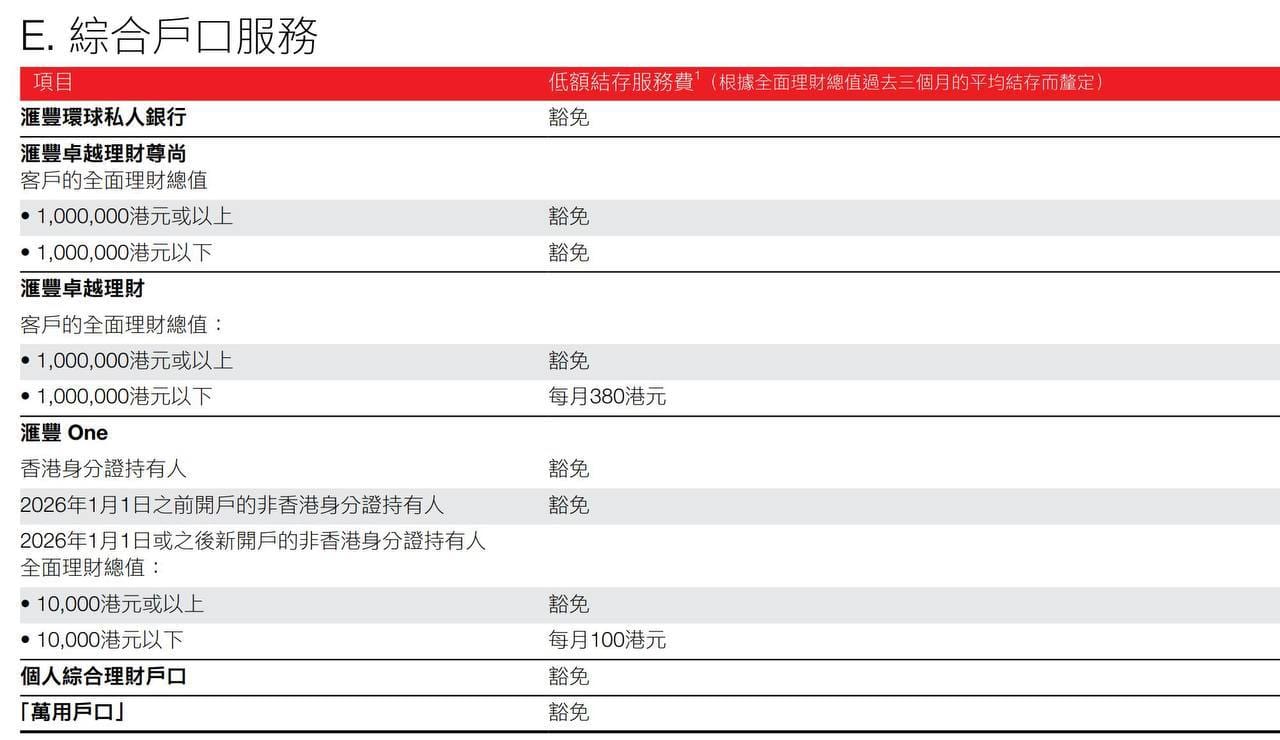 凡于2026年1月1日或以后开立帐户、且并非持有香港身份证的客户,如其全面理财总值低于1万港元,将须缴付每月 100 港元的低额结存服务费。